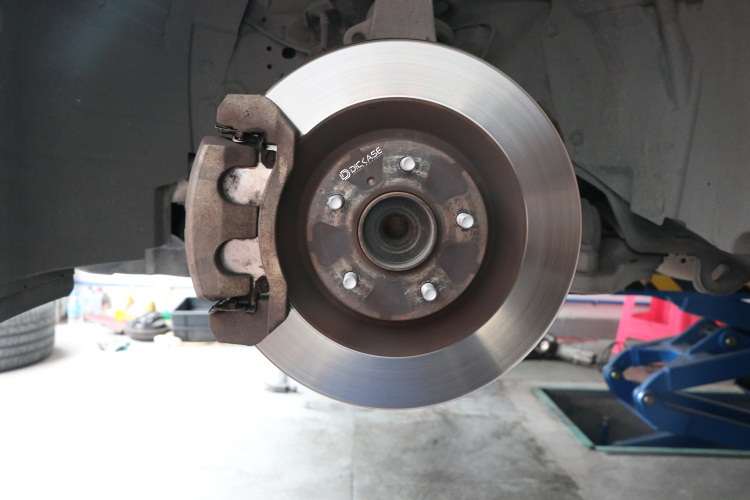 卸下輪轂,我們可以清晰地看到原車瘦小而且灰撲撲的卡鉗,簡單的剎車盤。