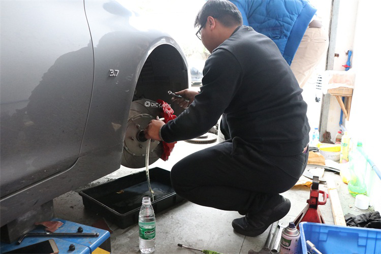 打開卡鉗排空口,接入透明導管,導管的另一頭接到裝廢棄剎車油的容器內。打開剎車油油箱,緩緩而不間斷地倒入AP剎車油,一人在駕駛位不停踩剎車,直到導管出現干凈亮澄的剎車油停止,馬上蓋上剎車油油箱蓋。(不要直接把廢棄剎車油排到地上,剎車油具有一定腐蝕性,而且地滑容易發生意外。)