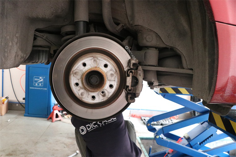 首先拆卸輪轂,拆卸原車卡鉗和剎車盤。原車的剎車卡鉗非常小,而且是單向卡鉗,剎車性能會比較弱。而且原車剎車盤的尺寸小,散熱性能差,高速剎車效果不理想。